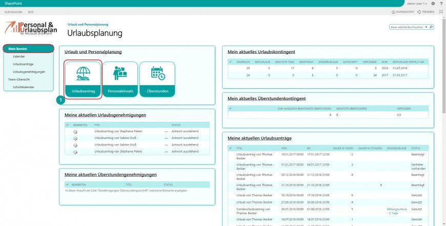 Um einen Urlaubsantrag zu stellen, klicken Sie im Hauptmenü links auf „Mein Bereich“. Mit einem weiteren Klick auf das Icon „Urlaubsantrag“ gelangen Sie auf das Formular zum Stellen von Urlaubsanträgen (1).